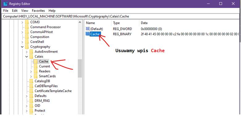 2. Rozwinąć odpowiednie foldery zgodnie z : HKEY_LOCAL_MACHINE\SOFTWARE\Microsoft\Cryptography\Calais\Cache